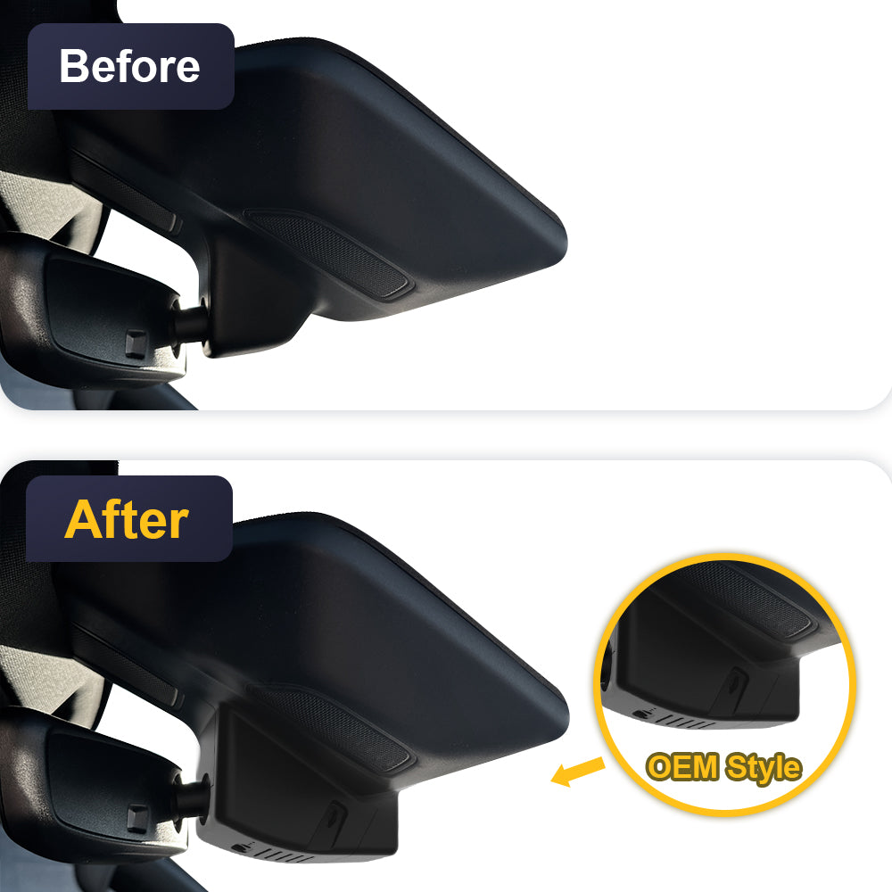 The OEM-style dash cam with a 1:1 restoration of the original rearview mirror back cover shape design, which will not block the driving line of sight.