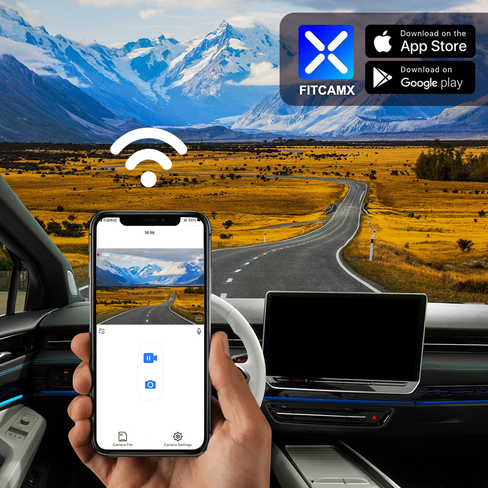Using phone APP to connect the WiFi of FITCAMX dash cam for downloading videos and sharing them to your social media. Downloading videos is no need for mobile data traffic. (support in Android & IOS)