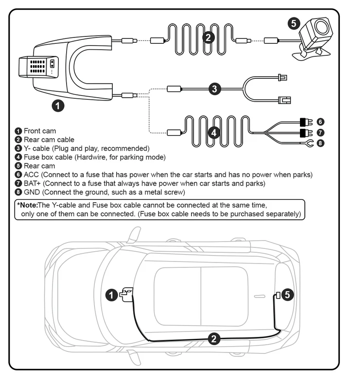 | Rear Cam Installation | / | Hard wire from the front cam | Hard wire from the front cam |