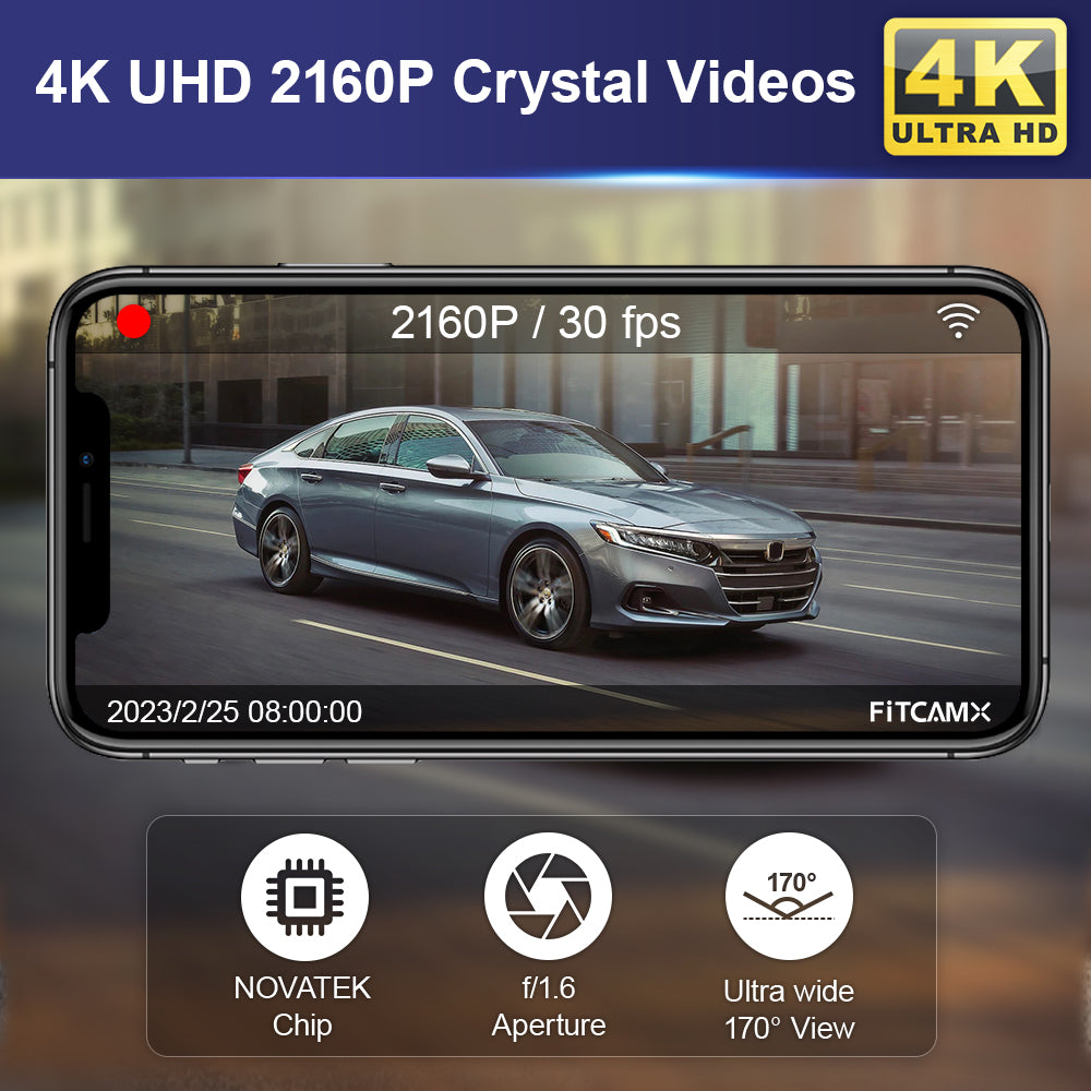 Ausgestattet mit einem f/1,6-Objektiv mit großer Blende und einem Novatek-Chip, um hochauflösendes Video mit 2160P/30fps zu ermöglichen, kann die Dashcam im OEM-Stil von Fitcamx die Bildleistung in jeder Hinsicht verbessern. Die Bild- und Videoqualität ist recht gleichmäßig und kann sowohl bei schwachem als auch bei hellem Licht klare Videos aufnehmen.