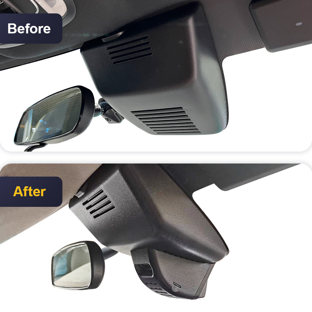 Die Dashcam im OEM-Stil mit einer 1:1-Wiederherstellung der ursprünglichen Form der hinteren Rückspiegelabdeckung, die die Sichtlinie des Fahrers nicht blockiert.