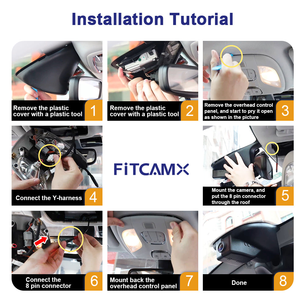 Die FITCAMX-Dashcam verfügt über brandneue Methoden zur Stromversorgung über die Dachkonsole mit versteckter Verkabelung und einfacher Installation mit der Plug-to-Plug-Methode. Es ist nicht erforderlich, die A-Säule zu entfernen und den Sicherungskasten des Autos und den Zigarettenanzünder anzuschließen.