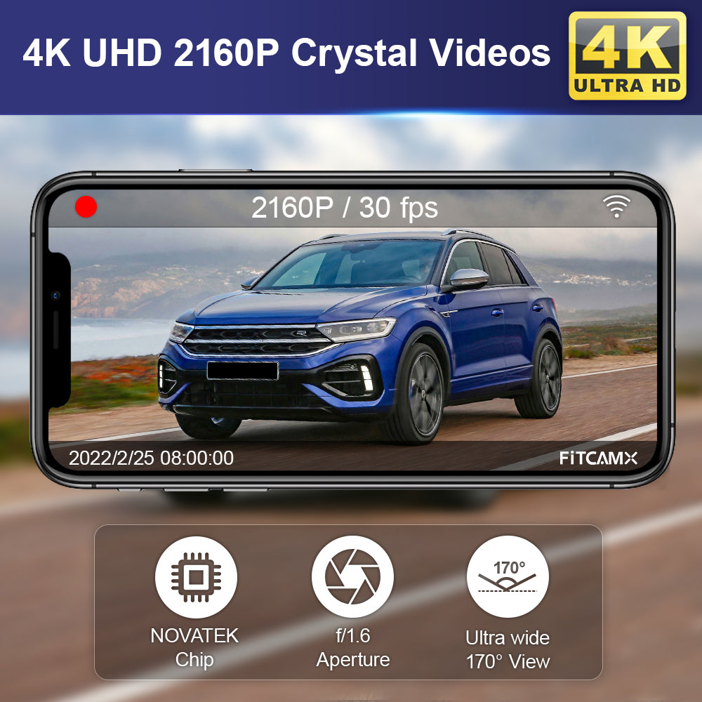 Ausgestattet mit einem f/1,6-Objektiv mit großer Blende und einem Novatek-Chip, um hochauflösendes Video mit 2160P/30fps zu ermöglichen, kann die Dashcam im OEM-Stil von Fitcamx die Bildleistung in jeder Hinsicht verbessern. Die Bild- und Videoqualität ist recht gleichmäßig und kann sowohl bei schwachem als auch bei hellem Licht klare Videos aufnehmen.