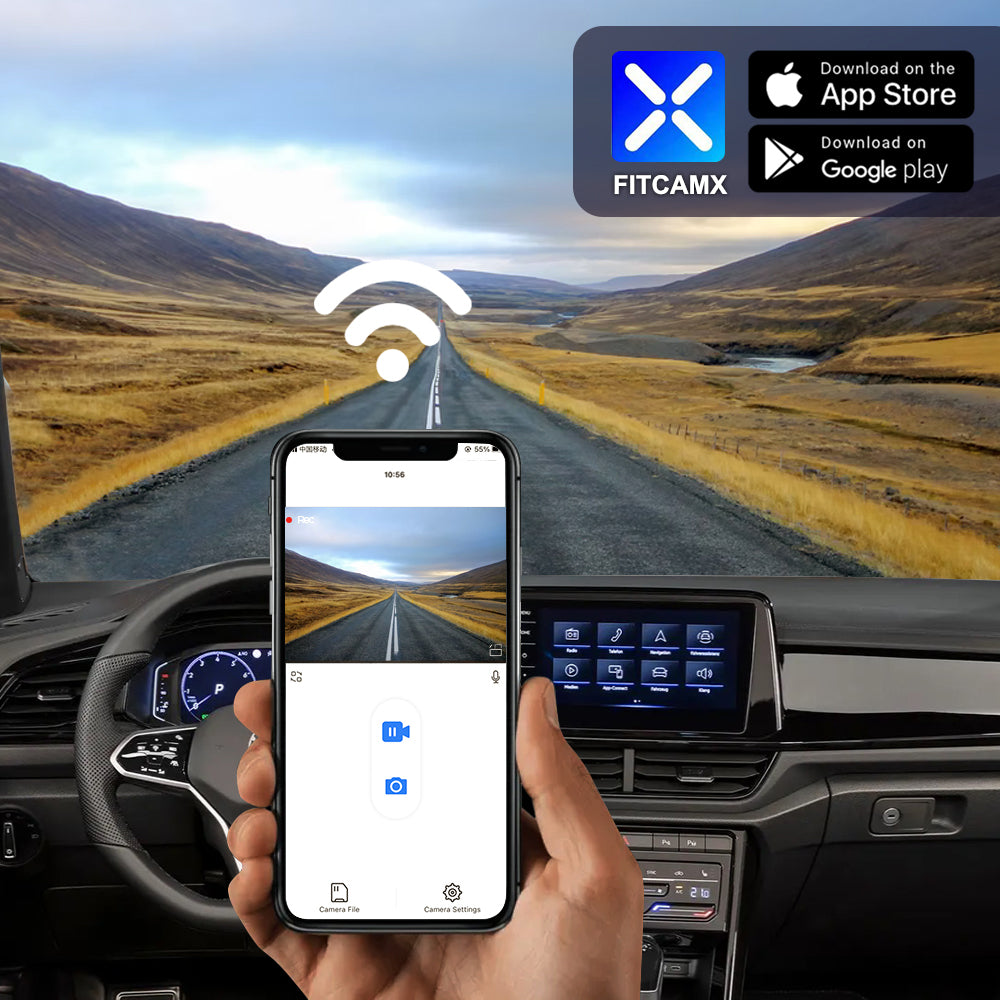 Verwenden Sie die Telefon-App, um das WLAN der FITCAMX-Dashcam zu verbinden, um Videos herunterzuladen und sie in Ihren sozialen Medien zu teilen. Für das Herunterladen von Videos ist kein mobiler Datenverkehr erforderlich. (Unterstützung in Android und IOS)