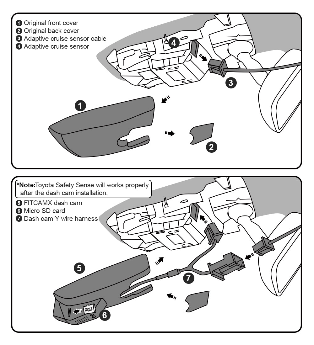 La cámara de tablero FITCAMX tiene nuevos métodos de alimentación desde el panel de consola superior/sensor de control de crucero adaptativo (ACC) con cableado oculto y fácil instalación con el método de enchufe a enchufe. No es necesario quitar el pilar A y conectar la caja de fusibles del automóvil y el encendedor.