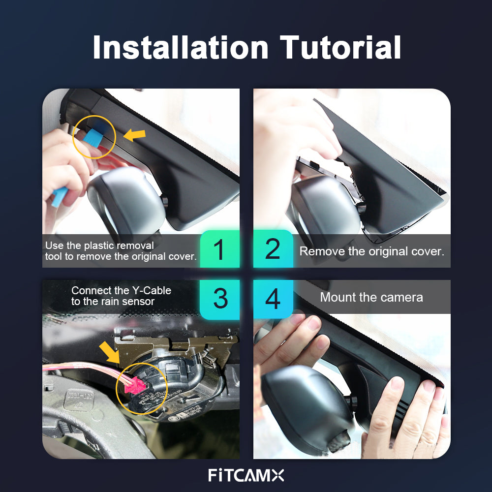 La cámara de tablero FitCamx tiene métodos nuevos para la energía de Sensor de lluvia con cableado oculto e instalación fácil con el método de enchufe para enchufar. No es necesario eliminar el pilar A y conectar la caja de fusibles del automóvil y el encendedor del cigarrillo.