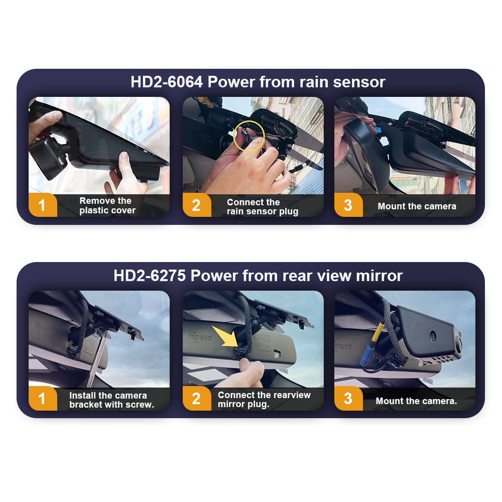 La cámara de tablero FitCamx tiene métodos nuevos para la energía de Sensor de lluvia y espejo de vista trasera con cableado oculto e instalación fácil con el método de enchufe para enchufar. No es necesario eliminar el pilar A y conectar la caja de fusibles del automóvil y el encendedor del cigarrillo.
