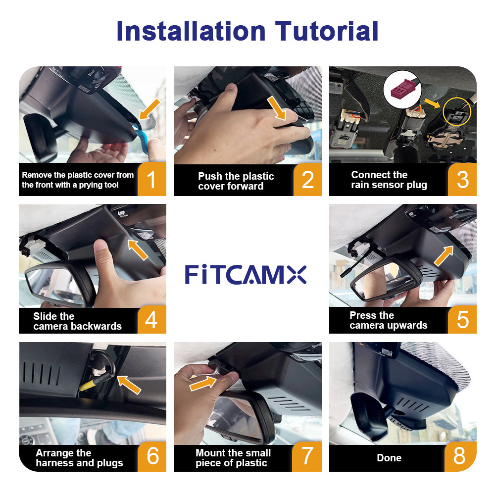 La cámara de tablero FitCamx tiene métodos nuevos para la energía de Sensor de lluvia o sensor ACC con cableado oculto e instalación fácil con el método de enchufe para enchufar. No es necesario eliminar el pilar A y conectar la caja de fusibles del automóvil y el encendedor del cigarrillo.