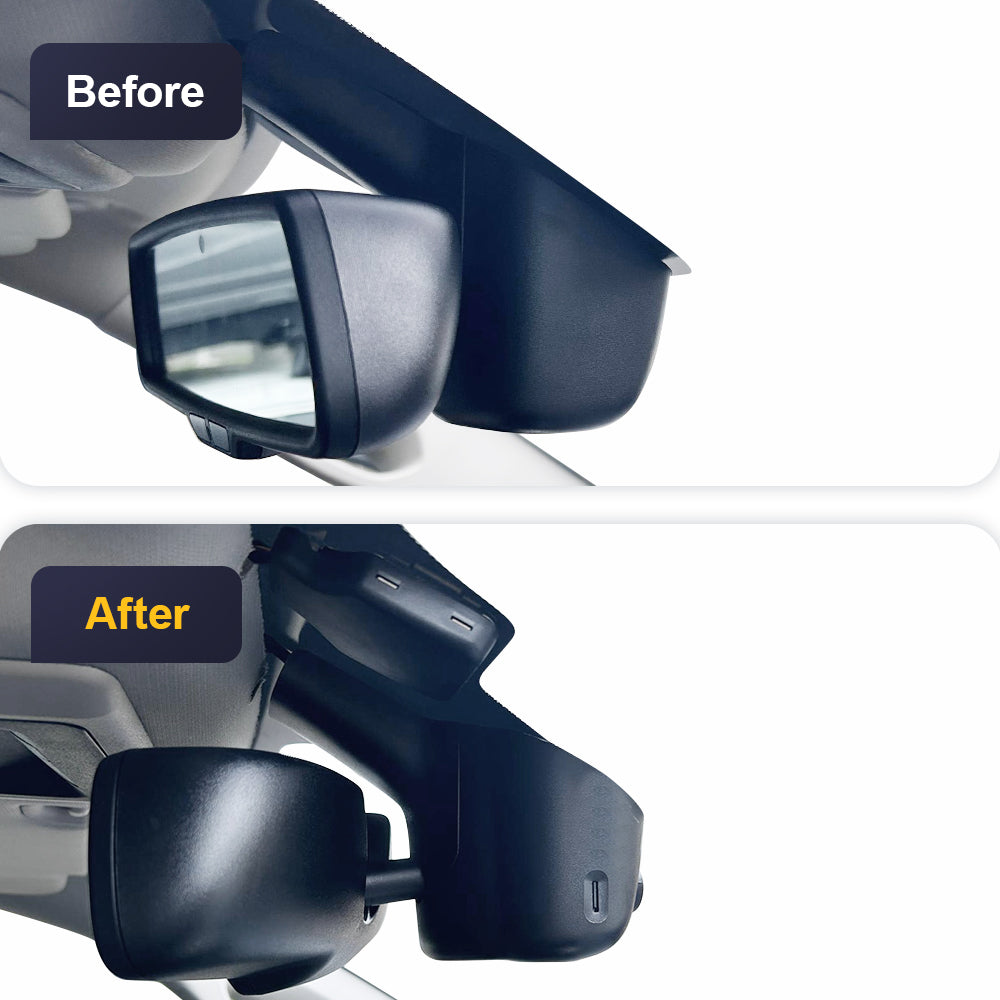 La cámara de tablero estilo OEM con una restauración 1:1 del diseño original de la forma de la cubierta trasera del espejo retrovisor, que no bloqueará la línea de visión de conducción.