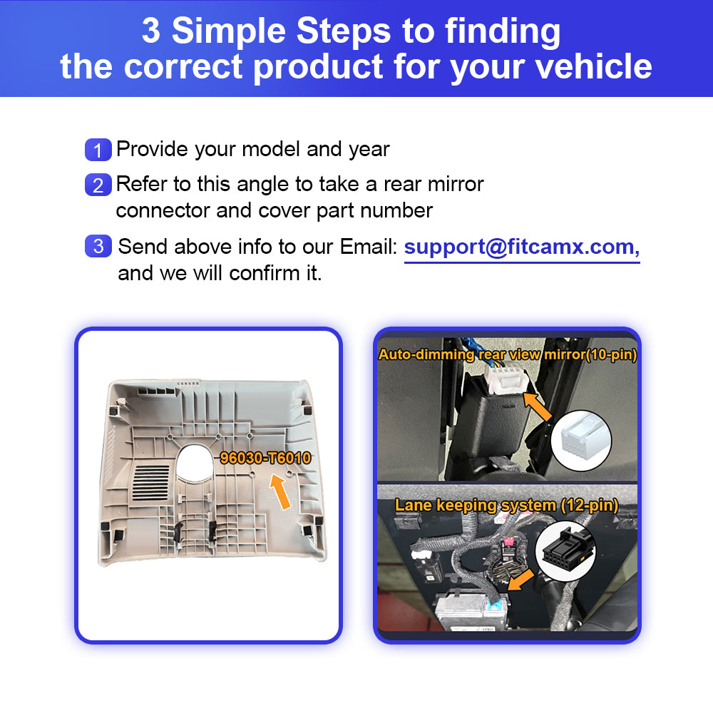 La cámara de tablero FitCamx tiene métodos nuevos para la energía de Espejo de vista trasera automática con cableado oculto e instalación fácil con el método de enchufe para enchufar. No es necesario eliminar el pilar A y conectar la caja de fusibles del automóvil y el encendedor del cigarrillo.