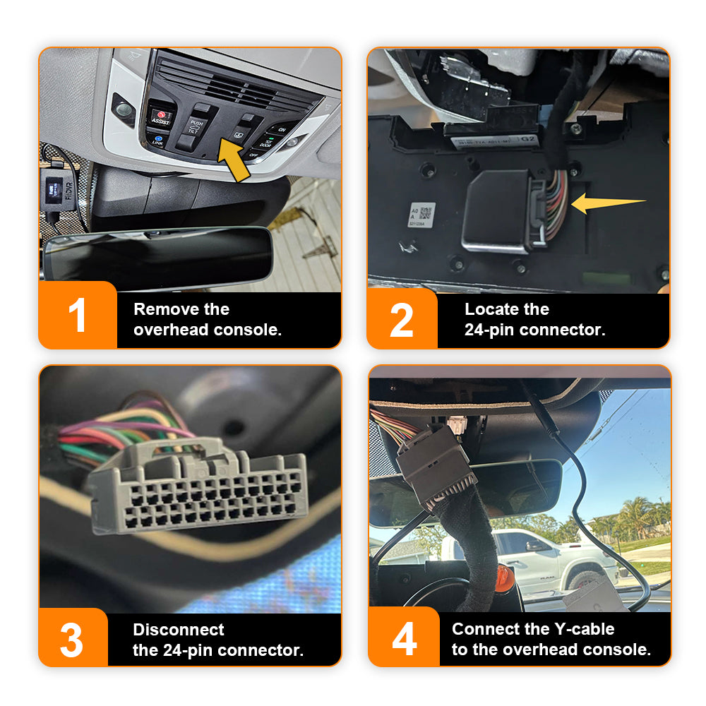 FITCAMX dash cam has brand-new methods for power from Overhead console with hidden wiring and easy installation with the method of plug to plug. No need to remove A-pillar and connect the car fuse box and the cigarette lighter.
