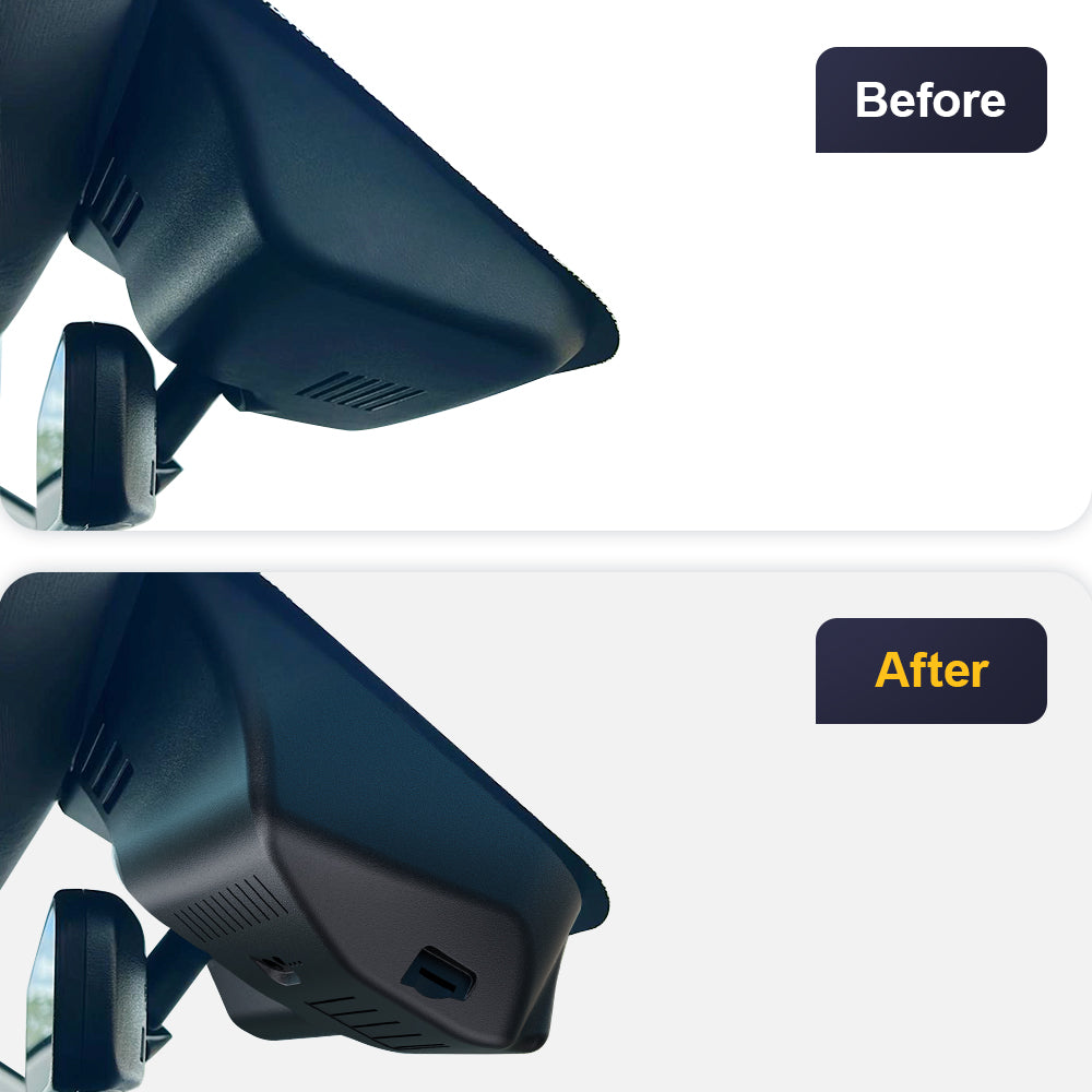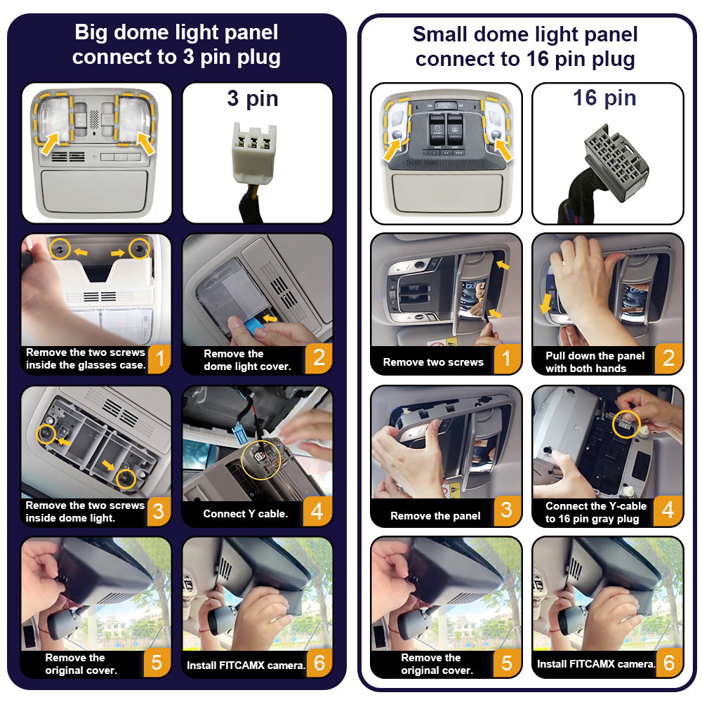 Fitcamx Dash Cam a de nouvelles méthodes de puissance à partir de Panneau de console aérienne avec un câblage caché et une installation facile avec la méthode de prise à boucher. Pas besoin de retirer le montant A et de connecter la boîte de fusibles de voiture et le allume-cigare.