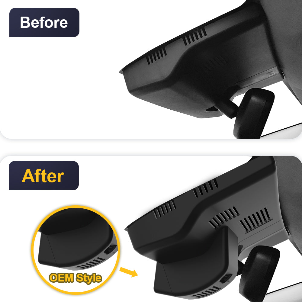 The OEM-style dash cam with a 1:1 restoration of the original rearview mirror back cover shape design, which will not block the driving line of sight.